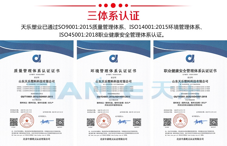 天樂(lè)塑業(yè)公司通過(guò)ISO質(zhì)量管理體系、環(huán)境管理體系、職業(yè)健康安全管理體系認(rèn)證,AAA企業(yè)信用等級(jí)認(rèn)證。